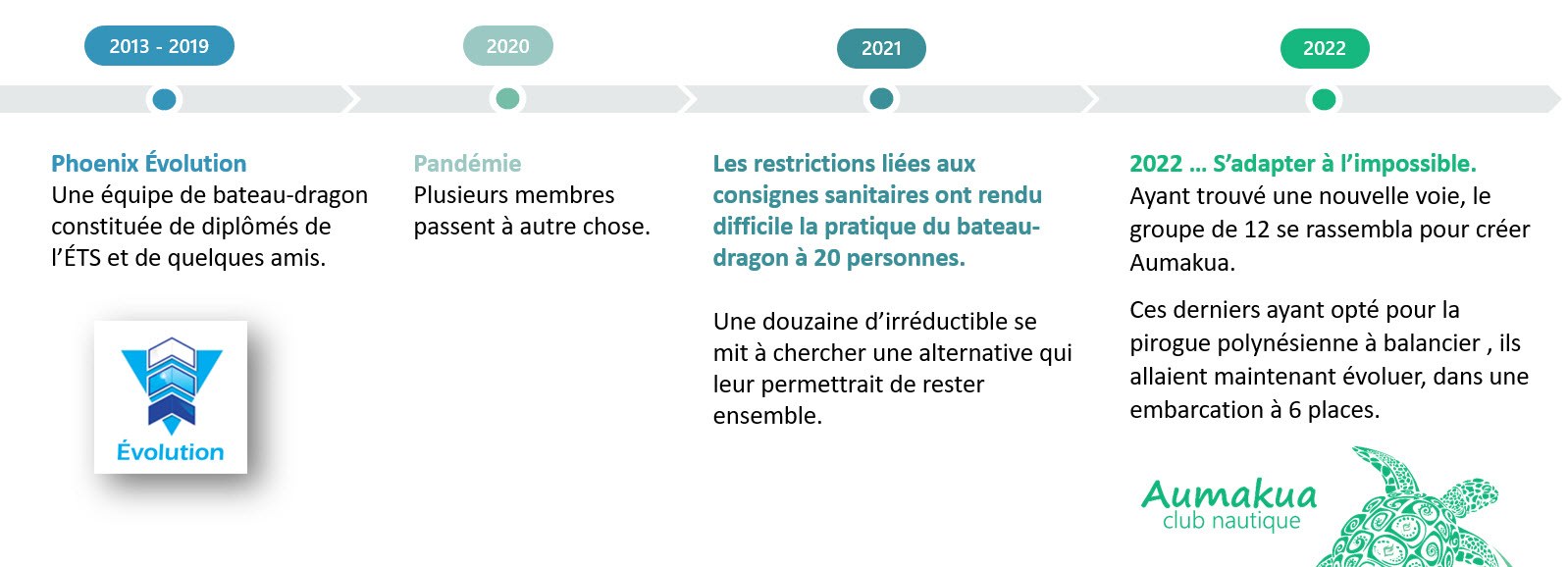 Aumakua est né de la transformation du club de bateau‑dragon des diplômés de l’ÉTS, Phoenix Évolution.
